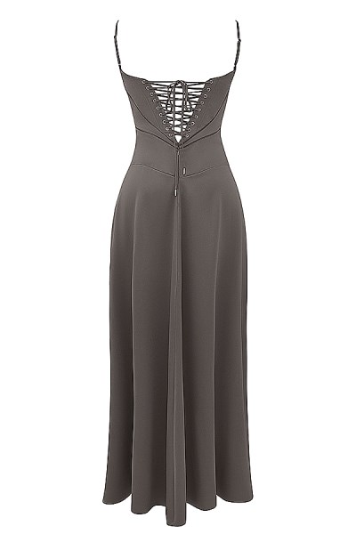'Anabella' is perhaps our most elegant dress yet and the epitome of luxurious event dressing. Cut from a lustrous Taupe silky satin for a fluid drape, 'Anabella' features a flattering neckline with delicate rouleau shoulder straps. The bodice has a curved hem that sits below the natural waistline and we're loving the corset inspired lace up back for a vintage feel. The skirt skims over the hips, falling freely to the floor and 'Anabella' would not be complete without high heels like our 'Paris' in black for glamorous events. The 'Regular Cup' option suits cup size A-C whilst the 'Bigger Cup' option suits cup size D-E.