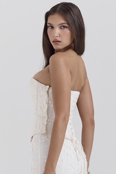 Brimming with romantic details, our 'Dakota' top is so elegant in ivory. The dainty fabric is embroidered with an abundance of dainty florals and 'Dakota' has a flattering strapless neckline. The corseted bodice cinches your waist and 'Dakota' is adorned with a vintage inspired lace up back that ties into a sweet bow yet zips to the back for easy on. Style yours as our designers intended with our equally as elegant 'Veronica' maxi skirt and dainty mules. WHERE TO WEAR: