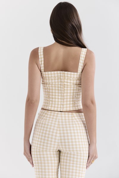 In a gorgeous gingerbread gingham, 'Lottie' is the prettiest corset that you're going to want to team your favourite jeans with. It's made from a luxurious airy viscose and the fitted, boned bodice cinches your waist. We adore the delicate contrast ribbon threaded throughout. 'Lottie' is easily our prettiest corset in this collection. It zips to the back for easy on.'Lottie' is made from luxurious airy viscose. The fitted, boned bodice cinches your waist and we adore the delicate contrast ribbon threaded throughout. 'Lottie' is easily our prettiest corset in this collection. It zips to the back for easy on.