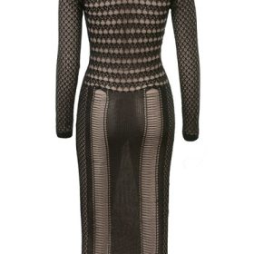 The 'Loula' dress is a masterclass in understated glamour. Crafted from a luxurious metallic yarn, this midi-length piece effortlessly combines stretch and structure for a flattering, body-hugging fit. The dramatic plunge neckline adds a sultry touch, balanced by long sleeves that make it perfect for cooler weather. Intricate knit detailing creates a stunning interplay of texture and shimmer, while the elegant silhouette transitions seamlessly from day to night. Whether paired with heels for an evening event or styled more casually, 'Loula' is your go-to for weather-appropriate sophistication with a touch of sparkle. Made with Viscose, a natural fibre made from regenerated cellulose. Known for its smooth and luxurious properties. TEAM YOURS WITH: