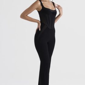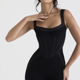 Made from stretch crepe, power mesh and satin. Fully lined bodice. Stretch Factor: 2/3 Designed For House Of CBCheck out more Jumpsuits here Length: Approx 152cmInside Seam Length of Trousers: Approx 83cmMaterials: Power Mesh, Medium Stretch Crepe, Single Duchess Satin, Stretch Satin