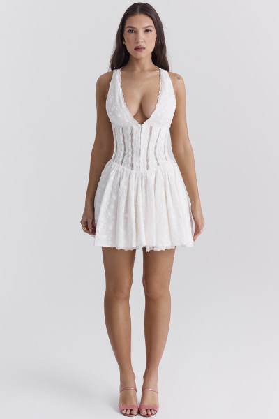 Our 'Sarita' mini dress is cut from airy white cotton-rich broderie anglais, making it perfect for warmer weather. It has dainty scalloped trims and a plunge neckline. The close fitting bodice has hook and eye detailing to the front and the pretty panels reveal just a hint of skin. We love the easy elegance of 'Sarita' and how it kicks out to voluminous, floaty mini skirt. It zips to the back for easy on. Wear yours with our 'Lola' heels in white. Taller girls, we heard you and this is available in two lengths, our regular mini length and 2 inches / 5cm longer. Regular: Approx 87cm and Longer 92cm. WHERE TO WEAR:Pretty date nights, romantic dinner dates, bottomless brunches, champagne with the girls, garden parties, vacays. TEAM YOURS WITH:'Lola' heels in white and a mini grab bag. UNDERWEAR SOLUTION:We suggest a balconette strapless bra if required. Made from cotton-rich Broderie Anglais 92% Cotton, 8% Poly.Fully Lined in 100% Viscose Stretch Factor: Little Stretch Designed For House Of CB