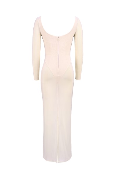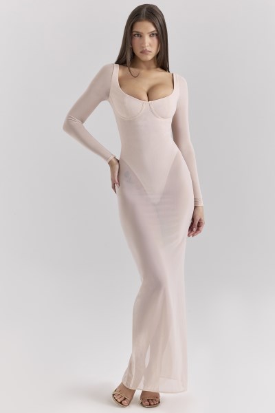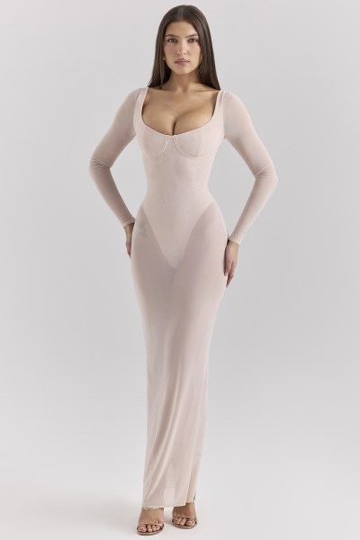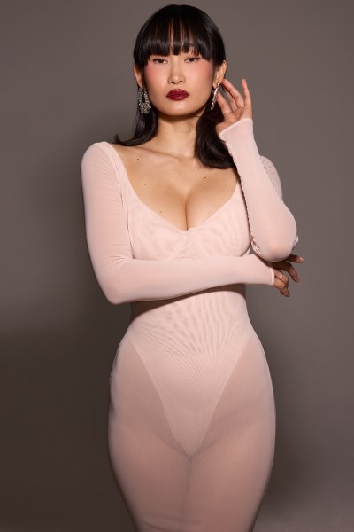 The ‘Everly’ blush mesh maxi dress is a show-stopping piece with long sleeves, a built-in bodysuit, and a curve-hugging silhouette. Its fitted, curve-hugging silhouette exudes confidence, with underwire cups in the bodice for added shape and support. A low back adds a sultry touch, while the semi-sheer mesh fabric creates a bold, layered effect. Perfect for evening events, cocktail parties, and glamorous nights out, ‘Everly’ combines style and convenience with a back zipper for easy wear. Perfect for evening events, cocktail parties, date nights, glamorous celebrations, or any occasion where you want to make a bold, unforgettable impression. For the perfect fit, our A-C cup girls will want to go for our ‘Regular Cup’ option, and our ‘Bigger Cup’ will best suit our D-E cup girls. WHERE TO WEAR: